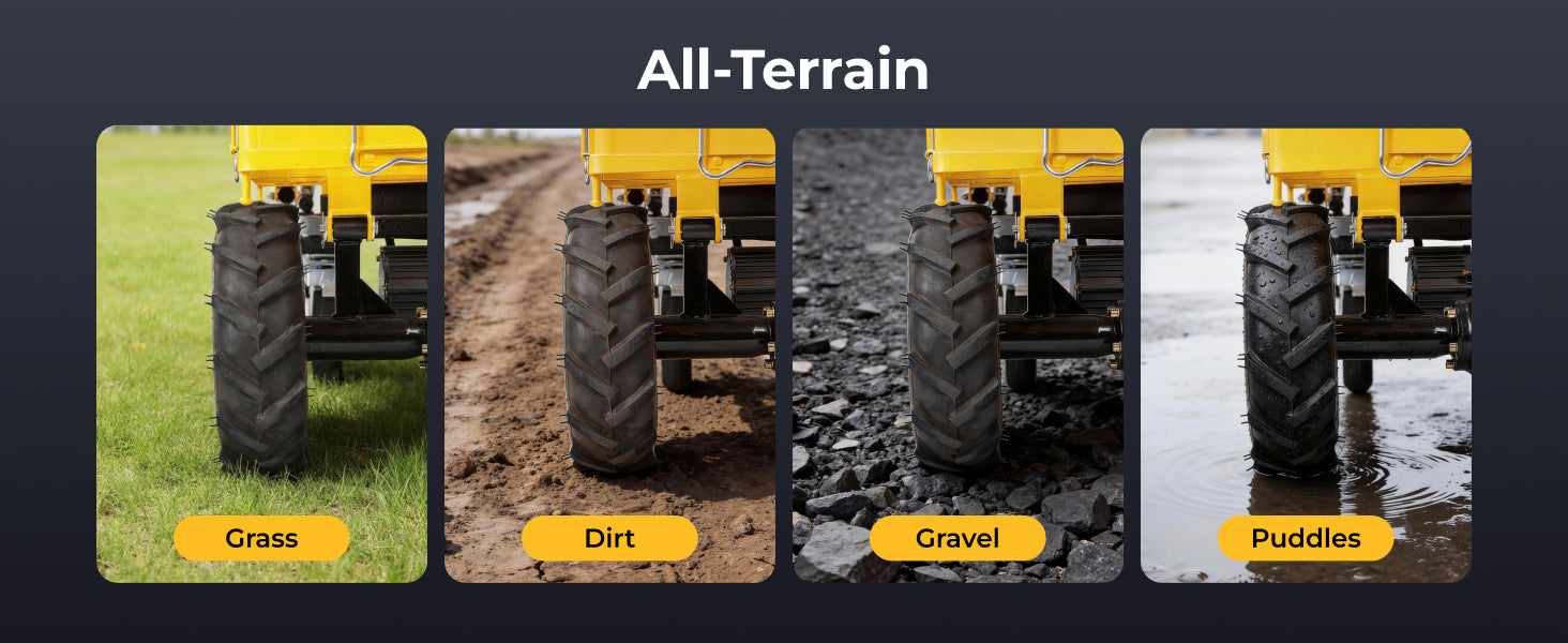 Yes. Its all-terrain wheel system—13-inch tank-style front wheels and 8-inch swivel rear wheels with high ground clearance—ensures smooth movement across grass, gravel, dirt, and other uneven surfaces.