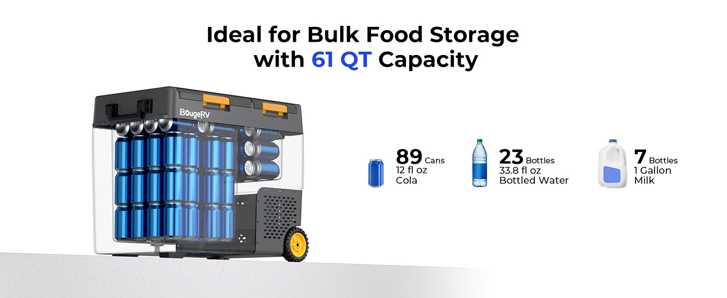 BougeRV 12V refrigrator can cool down to 32°F (0°C) or freeze down to -4°F (-20°C), depending on the settings. Ideal for long trips or full-time RV living.