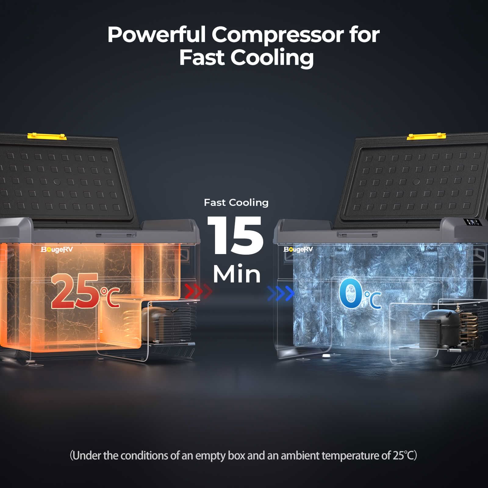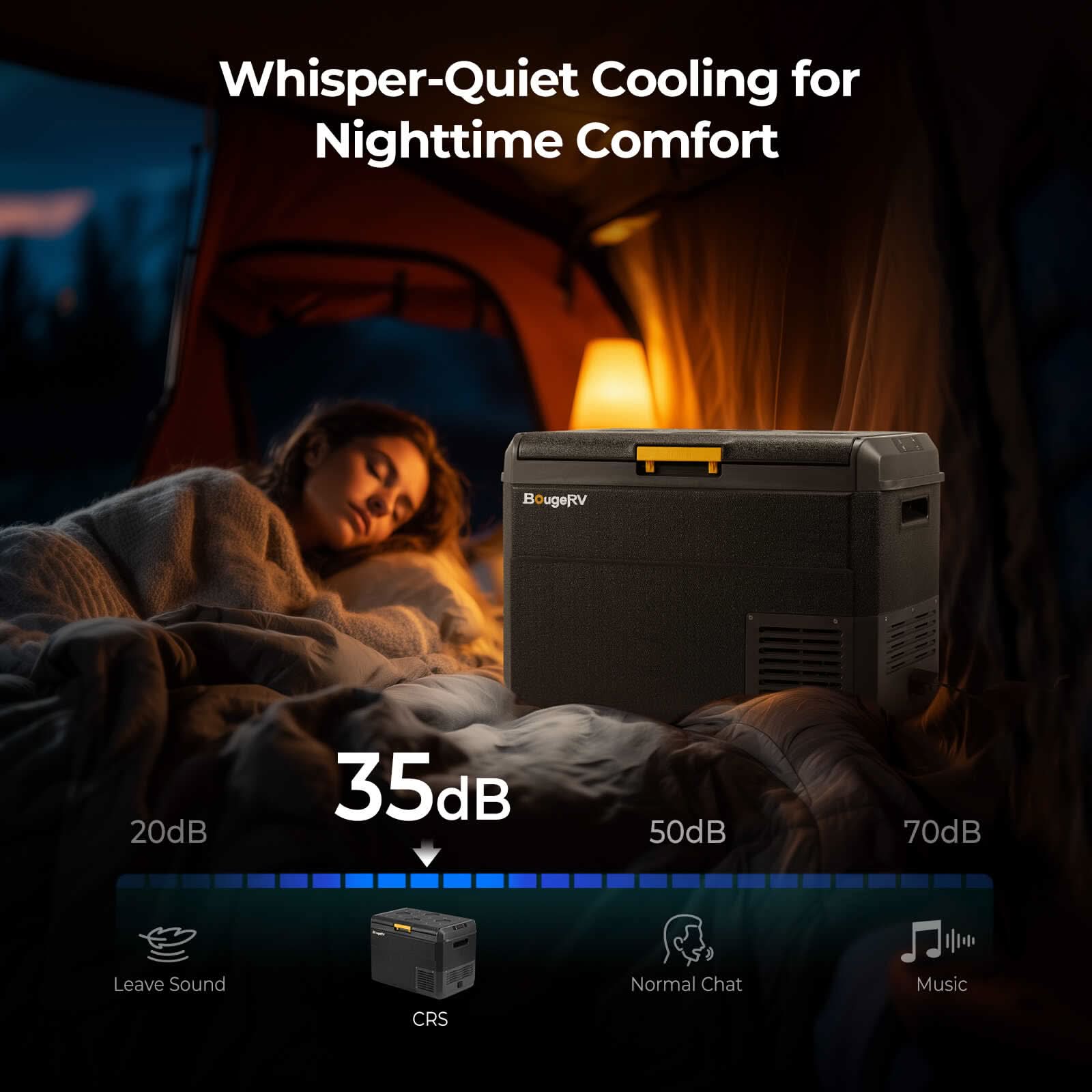 The BougeRV CRS 42QT 12 Volt portable car fridge is the perfect companion for your car freezer and camping needs, providing adjustable cooling from -20°C to 20°C. With a spacious 40L capacity (holding up to 58 cans), it features a powerful compressor that cools in just 15 minutes. Experience ultra-quiet operation at only 35dB, convenient smart APP control. This 12 Volt portable refrigerator is ideal for RVs, trucks, SUVs, and outdoor activities.