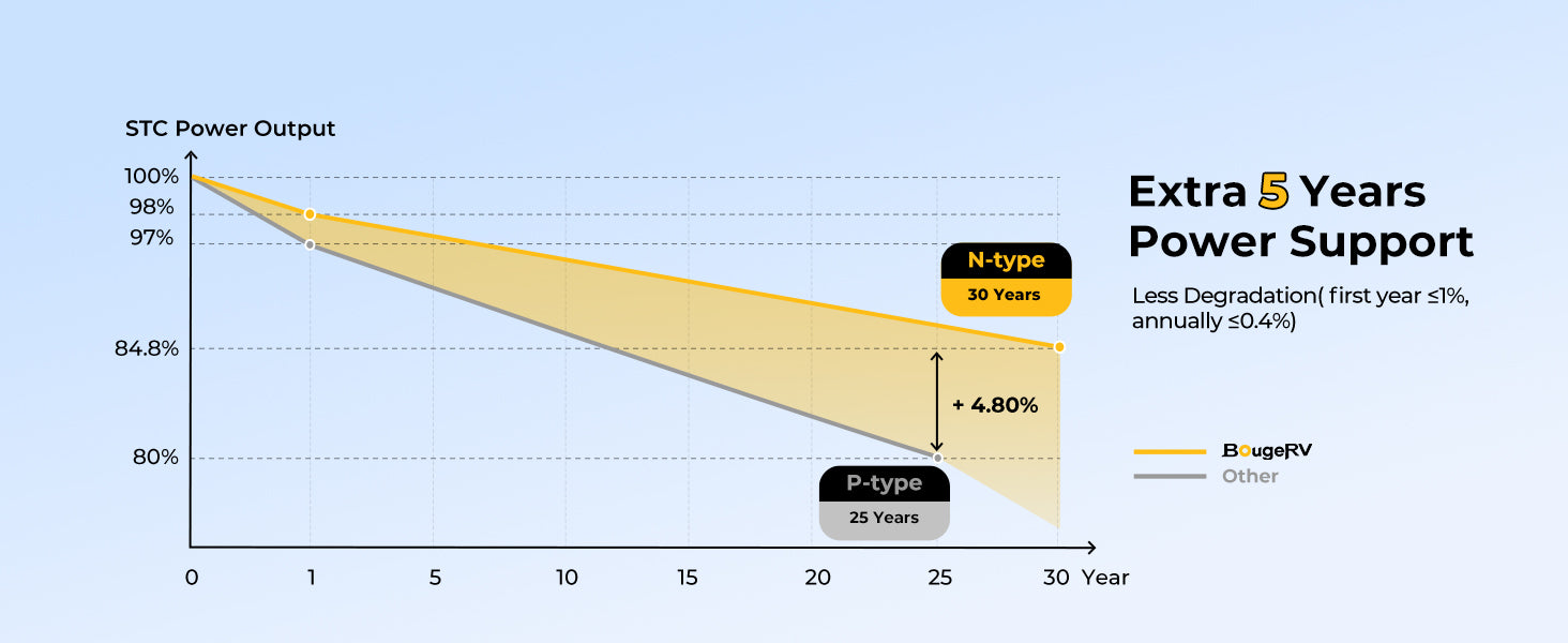 Engineered for extreme climates, our N-type cells thrive in peak summer. With an optimized -0.32%/°C temperature coefficient, our panel retains more wattage during heatwaves than standard alternatives. Ideal for desert camping and tropical off-grid systems.