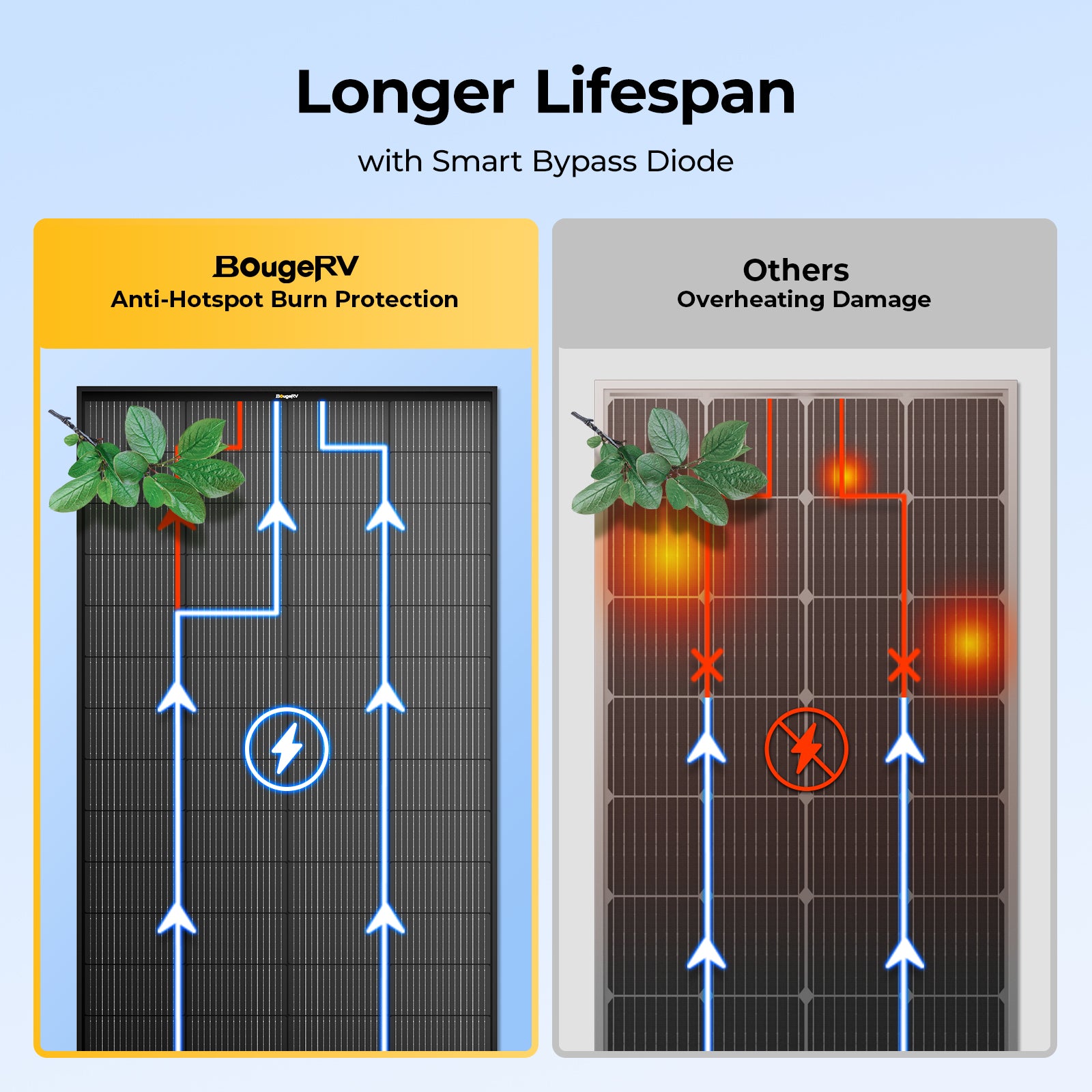 Don't let shadows compromise your safety. Equipped with specialized Anti-Hotspot Burn Protection, this N-type panel is designed to stay cool under pressure. By effectively bypassing blocked current, it prevents localized overheating and ensures the physical integrity of every cell. Enjoy peace of mind knowing your off-grid setup is protected by a self-regulating safety mechanism, 24/7.