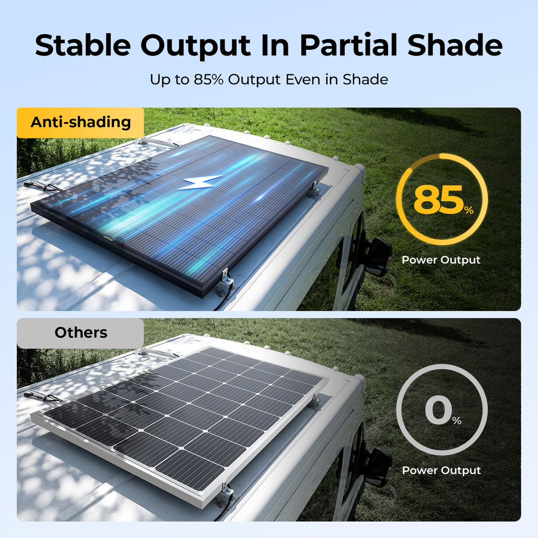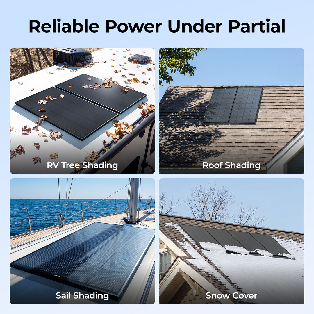 Built for real-world conditions, this 200W ShadowPower Solar Panel performs reliably even when sunlight is partially blocked. Whether your RV is parked under tree shade, your rooftop faces obstructions, or your boat experiences mast shadows, the panel continues to generate stable power. It’s also ideal for cabins surrounded by forests or environments with snow coverage, where traditional panels often lose efficiency. Designed to handle complex lighting conditions, it ensures consistent energy output where standard panels fall short.