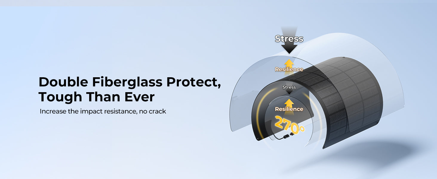 Designed for extreme conditions, the BougeRV curved fiberglass solar panel withstands strong winds (2400 Pa) and heavy snow (5400 Pa), reinforced by corrosion-resistant aluminum for a longer service life.