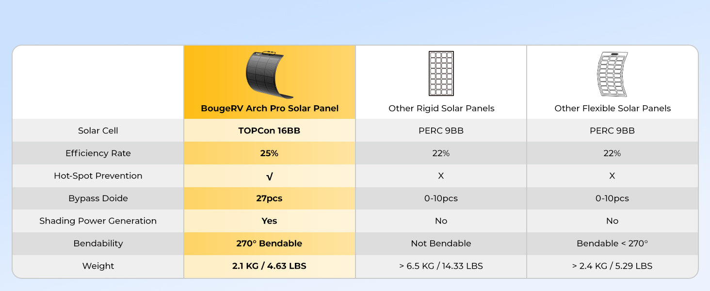 The Arch Pro 100W solar panel boasts a high conversion efficiency of 25%, thanks to its advanced N-Type TOPCon technology. This makes it one of the most efficient flexible solar panels available, ensuring optimal energy production for your off-grid needs.