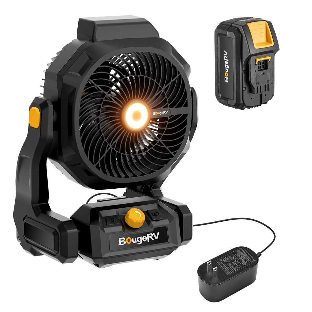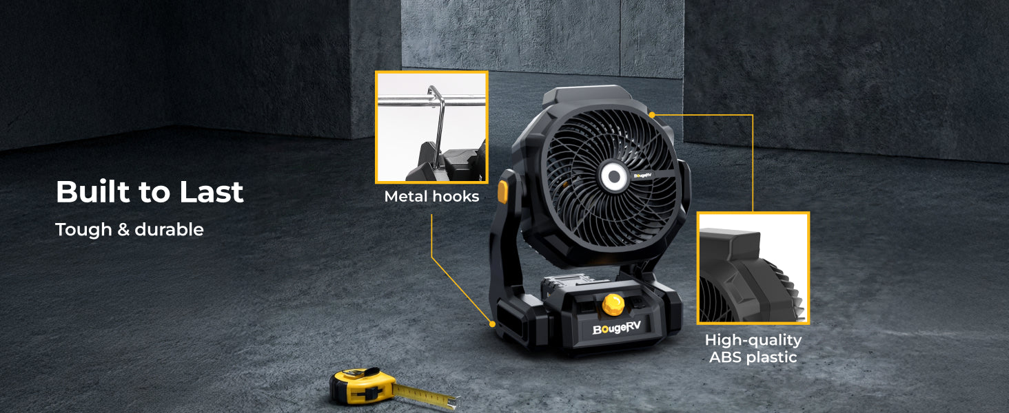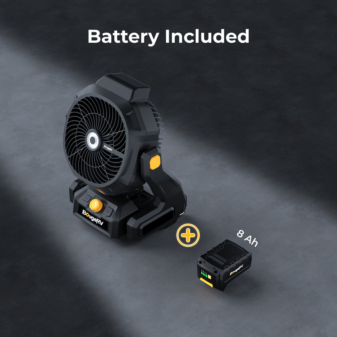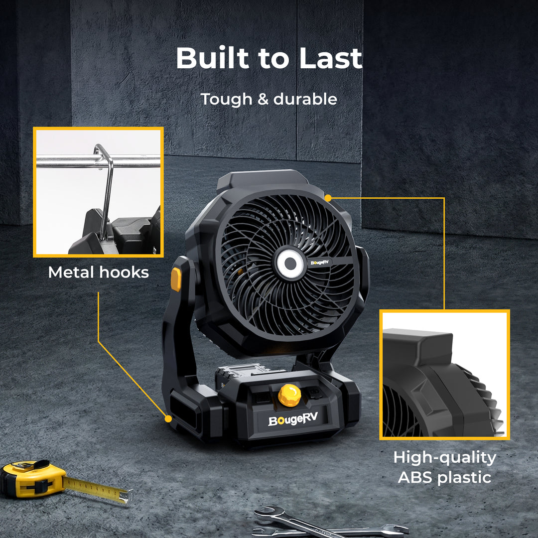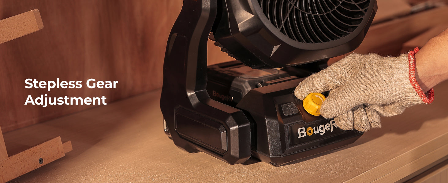 The BougeRV F02 outdoor fan delivers powerful airflow and long-lasting performance for demanding environments. With large fan blades and stepless speed control, it produces wind speeds up to 7.4 m/s and airflow up to 21.38 m³/min, providing effective cooling for jobsites, workshops, garages, farms, and outdoor activities.