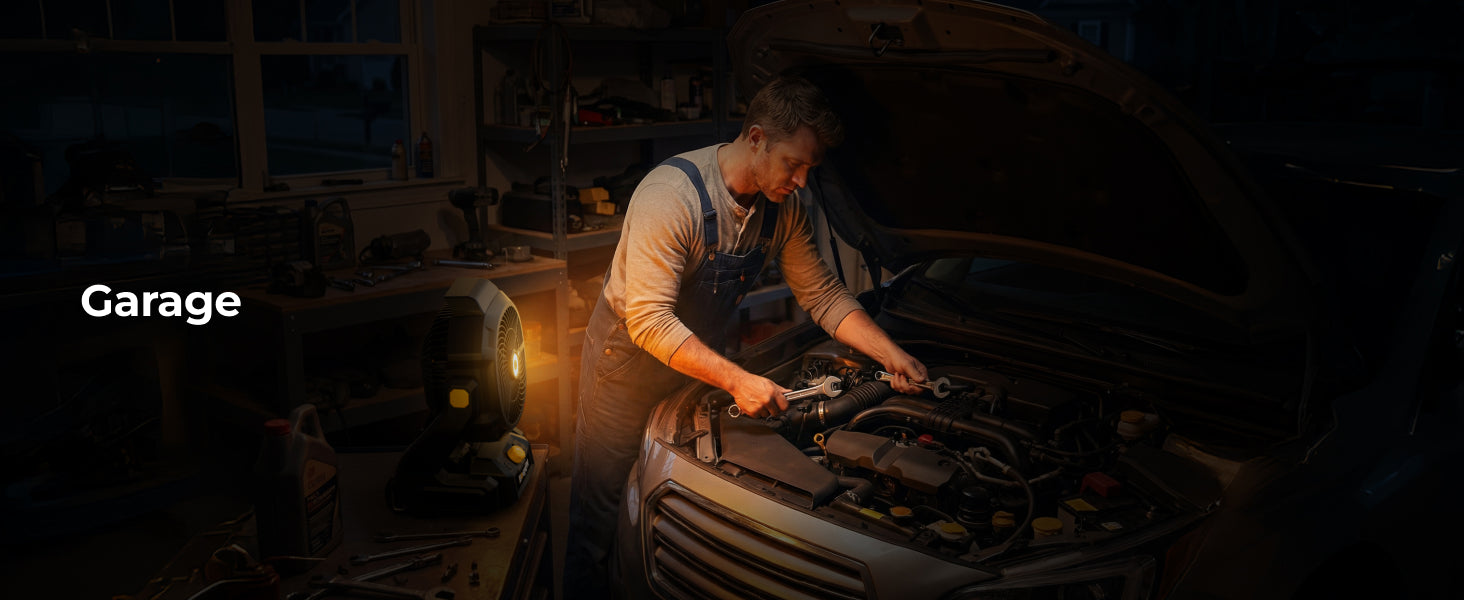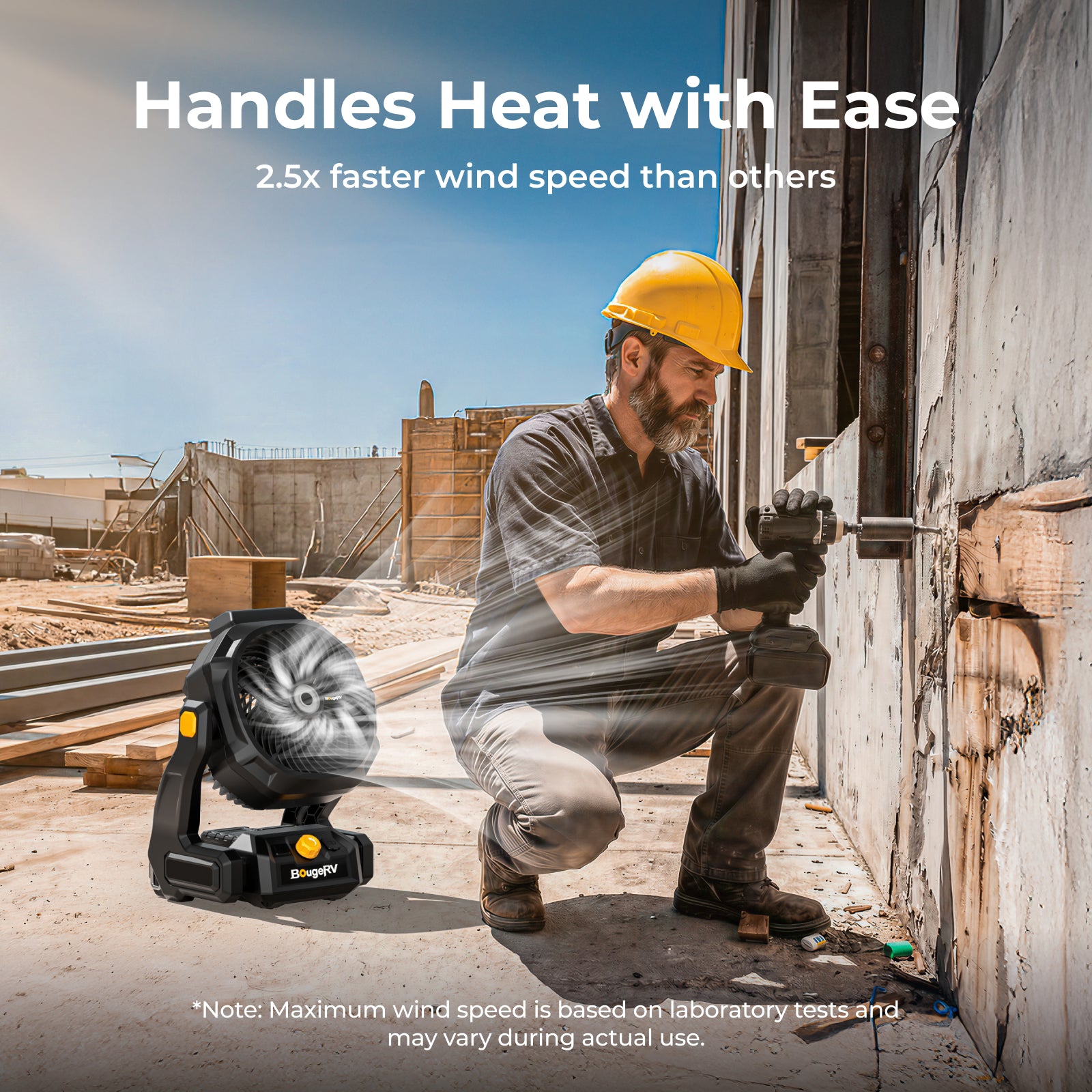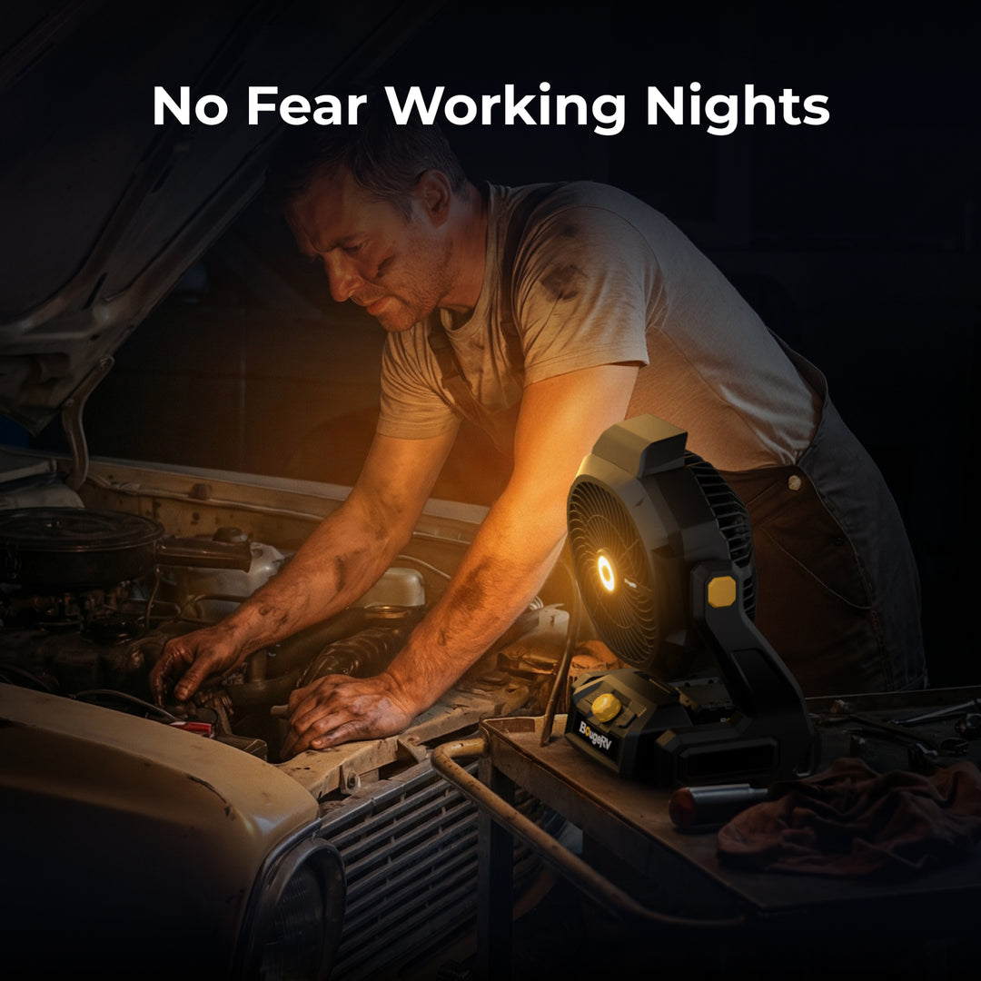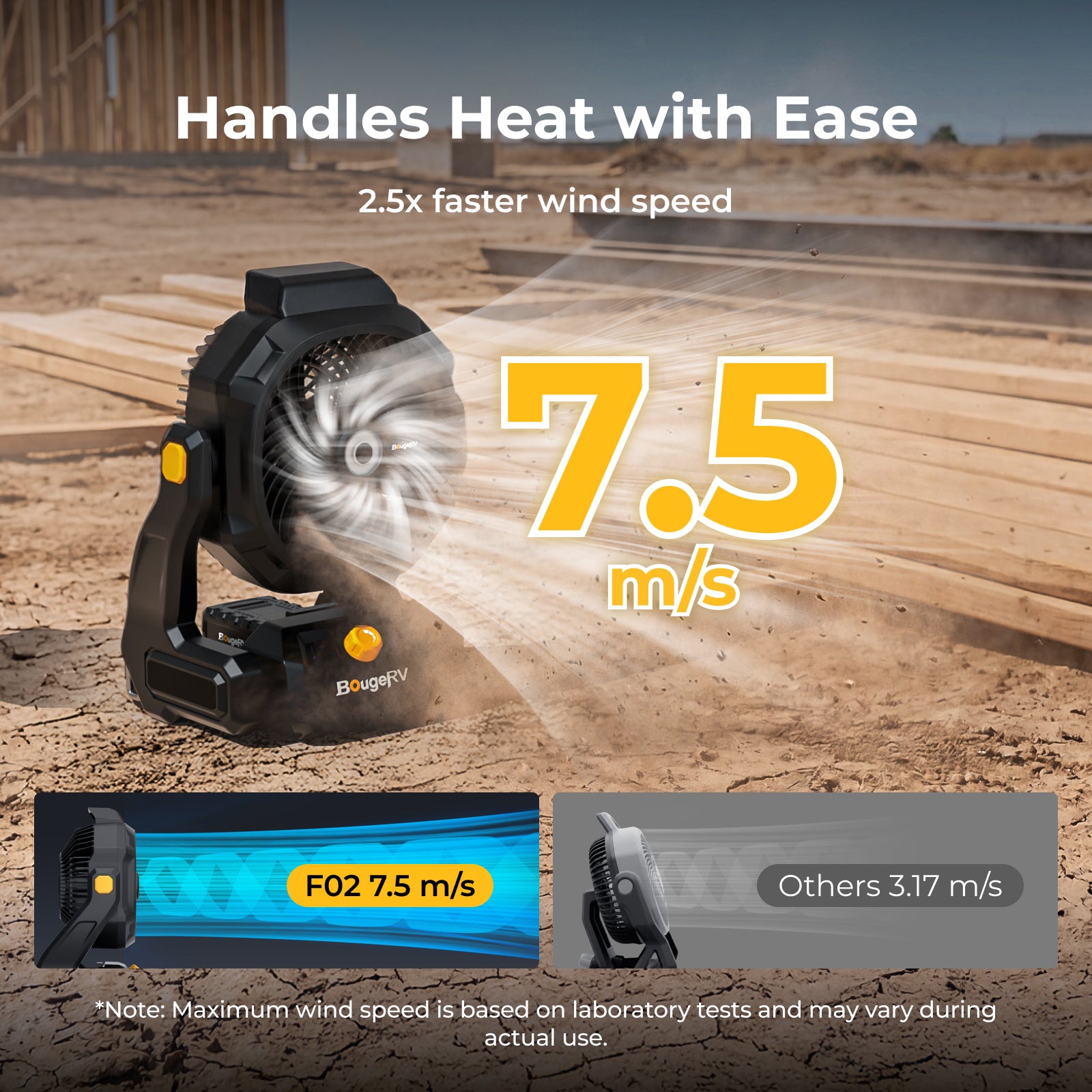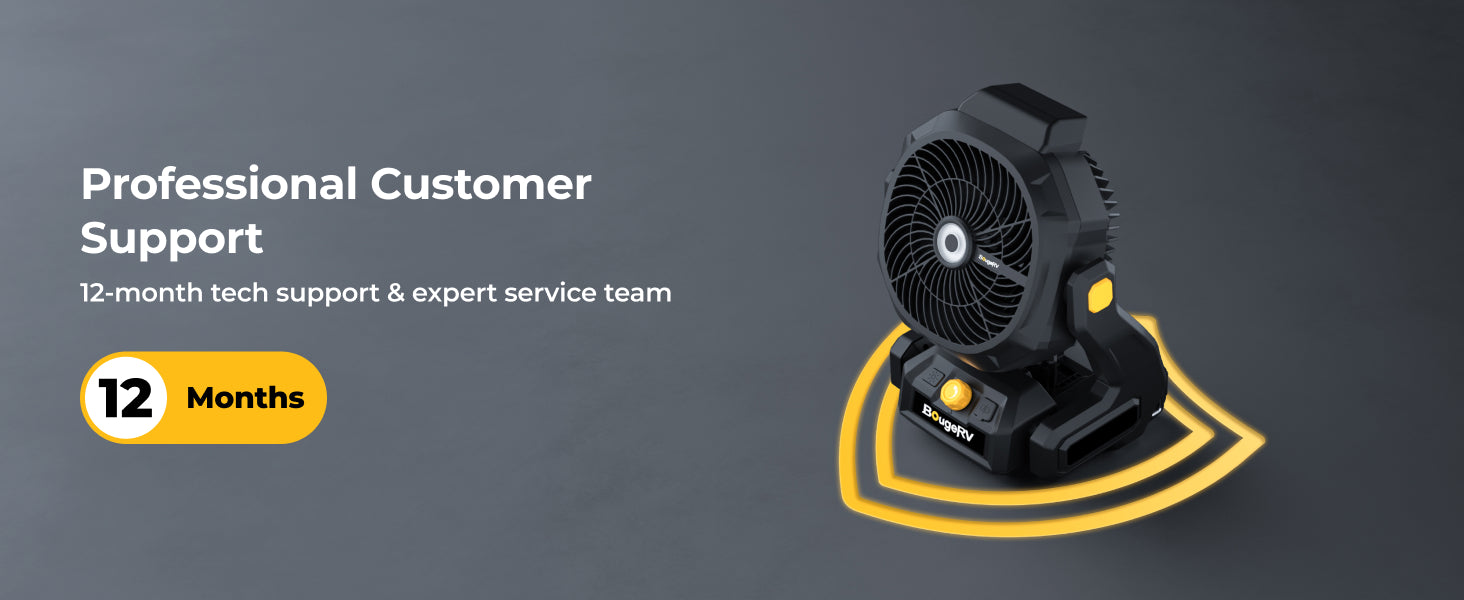 The BougeRV F02 outdoor fan delivers powerful airflow and long-lasting performance for demanding environments. With large fan blades and stepless speed control, it produces wind speeds up to 7.4 m/s and airflow up to 21.38 m³/min, providing effective cooling for jobsites, workshops, garages, farms, and outdoor activities.