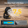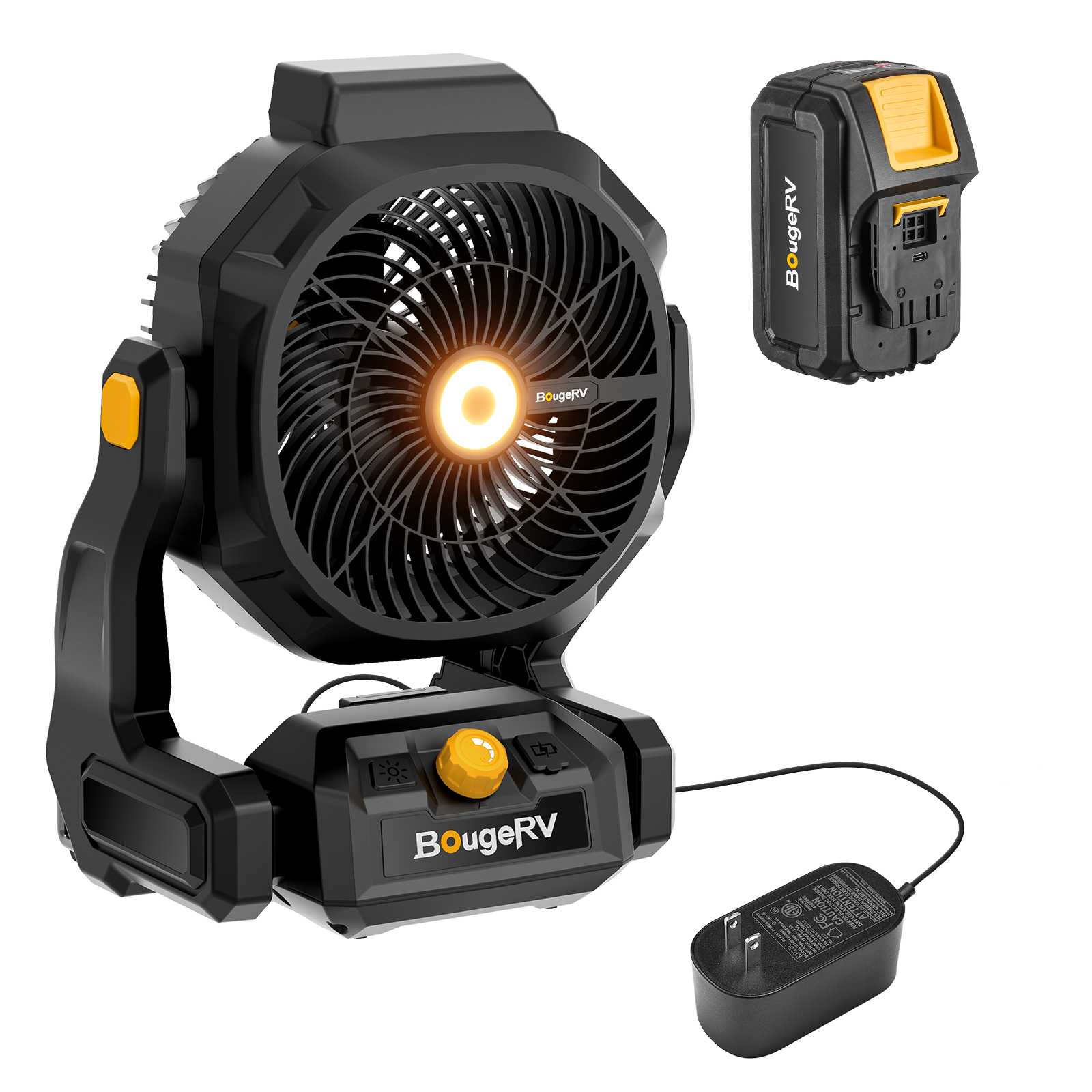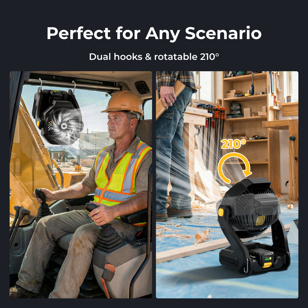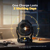 Equipped with a built-in 8Ah (144Wh) rechargeable battery, the fan runs 8–72 hours on a full charge, making it ideal for long workdays or camping trips. It also supports AC power, a removable battery, and a USB output for charging small devices.