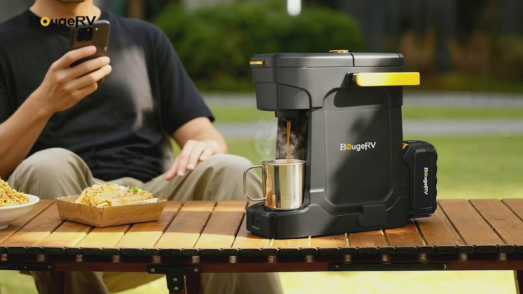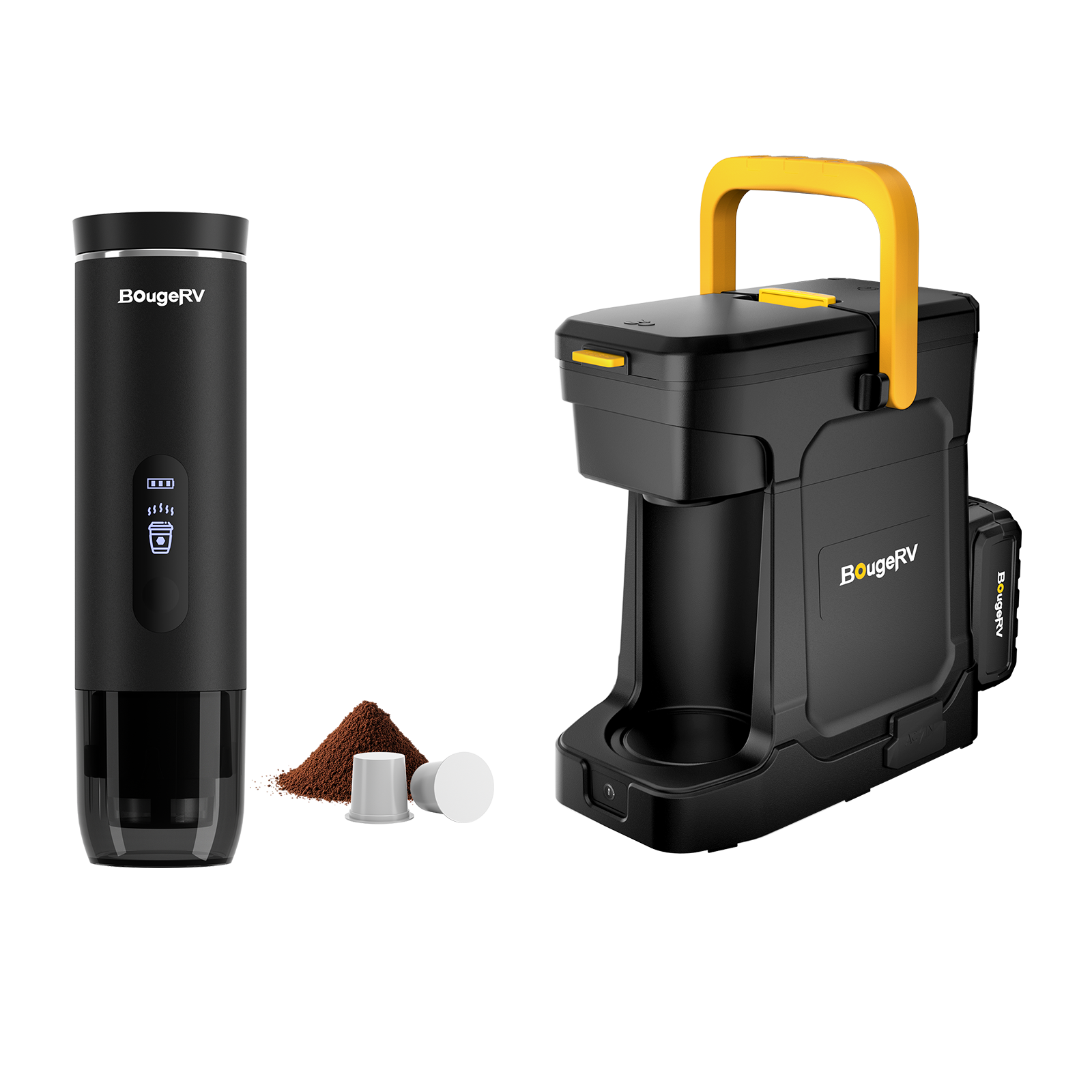 BougeRV portable coffee maker can run on its built-in battery or be powered directly from a compatible AC outlet or DC source. This dual-power design ensures uninterrupted brewing even when battery levels are low, providing maximum flexibility for travel, camping, RV use, and off-grid applications.