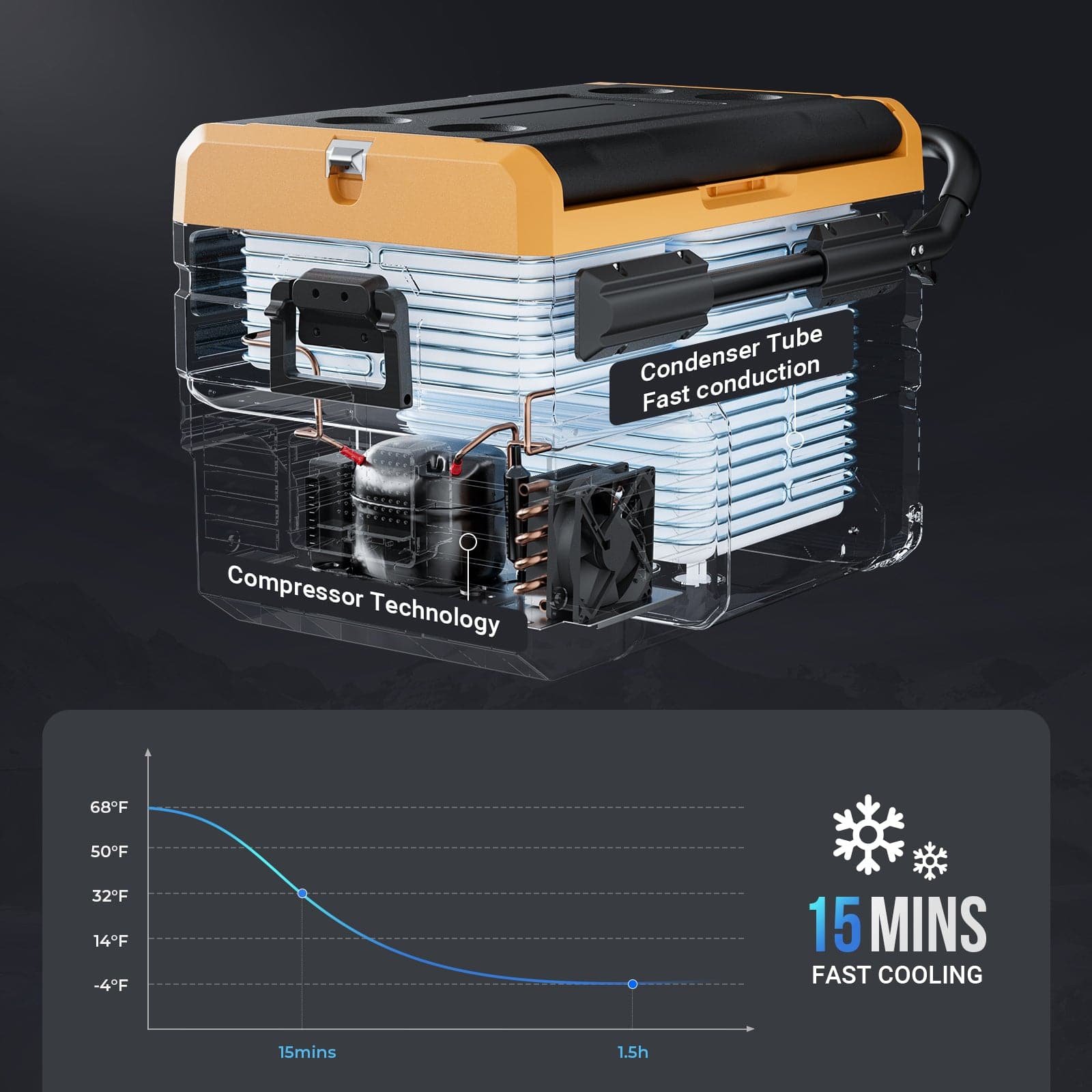 With compressor refrigeration technology, the BougeRV CR55 can achieve rapid cooling in just 15 minutes, keeping food fresh (68°F~32°F).