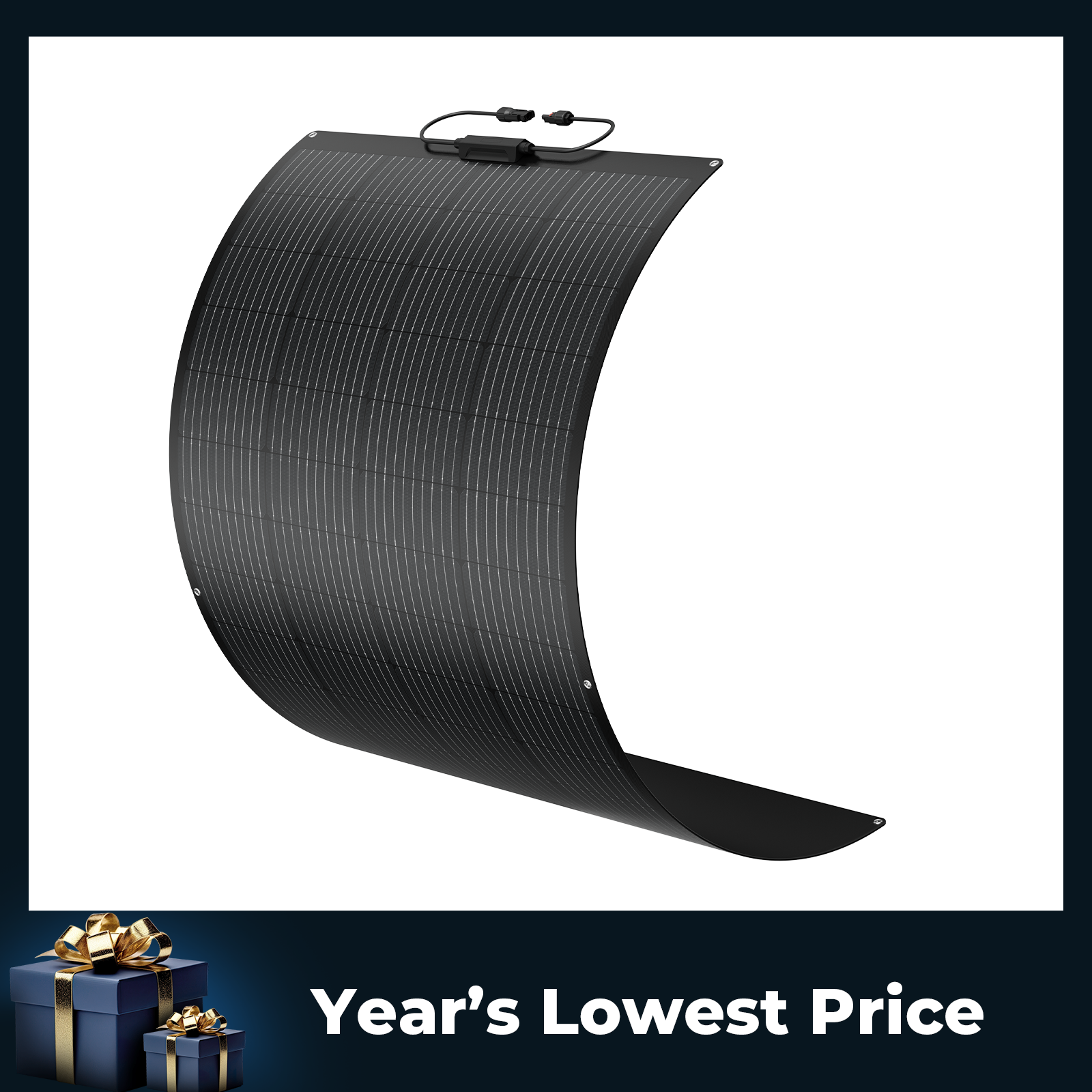 The BougeRV curved fiberglass solar panel is designed for durability, able to resist high wind (2400 Pa) and heavy snow (5400 Pa), with corrosion-resistant aluminum for an extended lifespan.