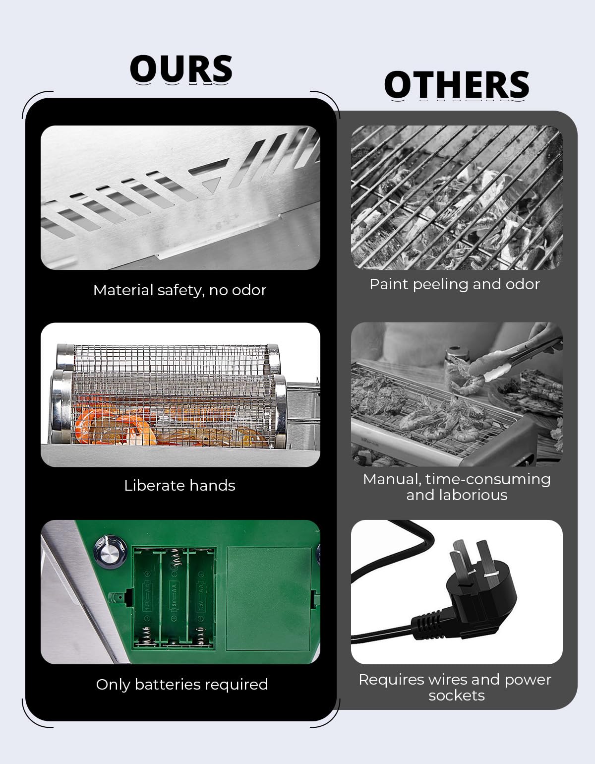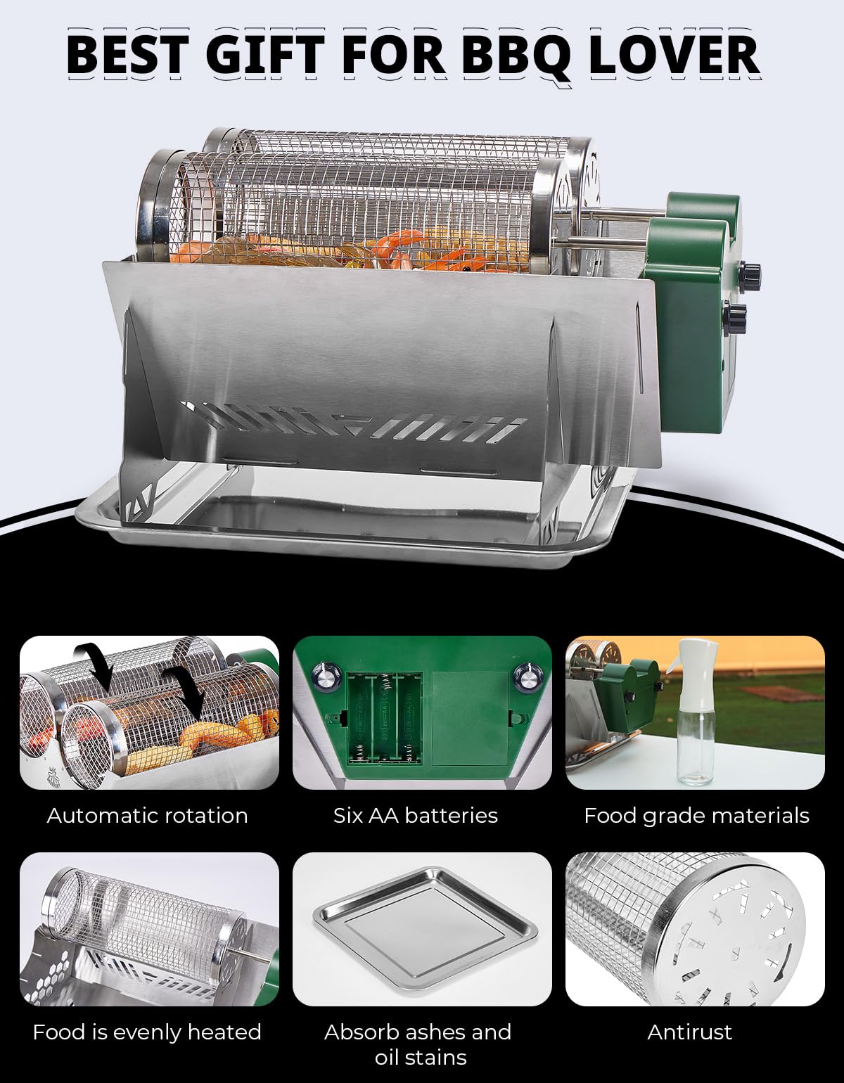 This electric rotisserie uses six AA batteries.