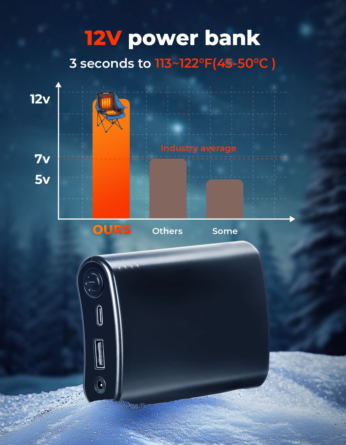 - Efficient Portable Power Bank – Comes with a 12V portable power bank that heats up to 122°F (50°C) in just 3 seconds. The Type-C fast charging port (12V 3.5A) supports both heating and device charging. Enjoy up to 4.4 hours of continuous warmth on the highest setting while keeping your phone powered during cold outdoor adventures.