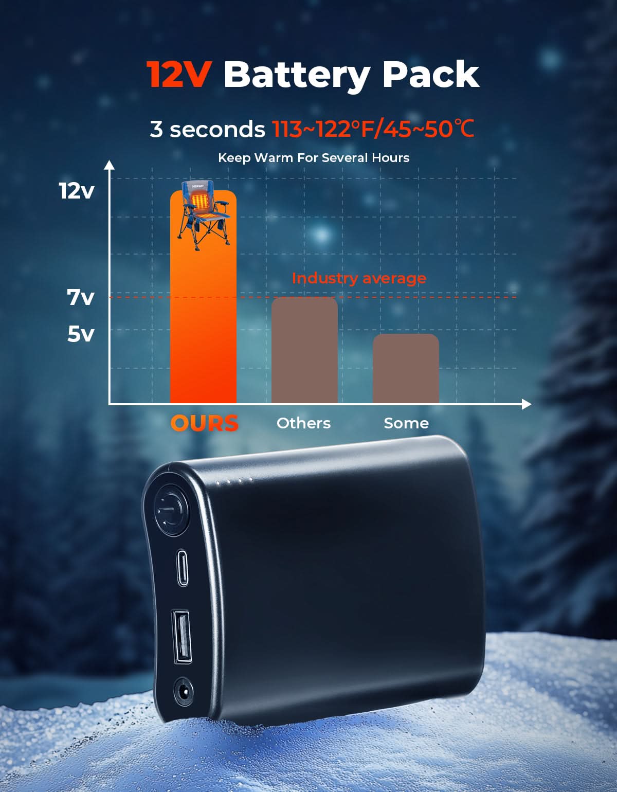 Fast Heating & Long-Lasting Warmth – Equipped with a 12V portable power bank and Type-C fast charging, the chair heats up to 122°F in just 3 seconds and provides up to 11 hours of warmth.