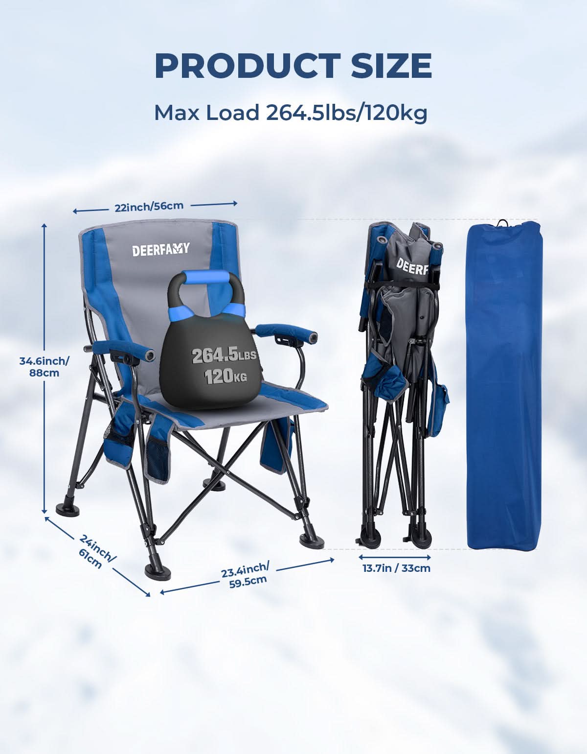 Easy to fold and store, with an unfolded size of 23.4"D x 24"W x 34.6"H, The oversized seat is very comfortable to sit on making it perfect for camping, fishing, backpacking, sports events, RV trips, and outdoor adventures.