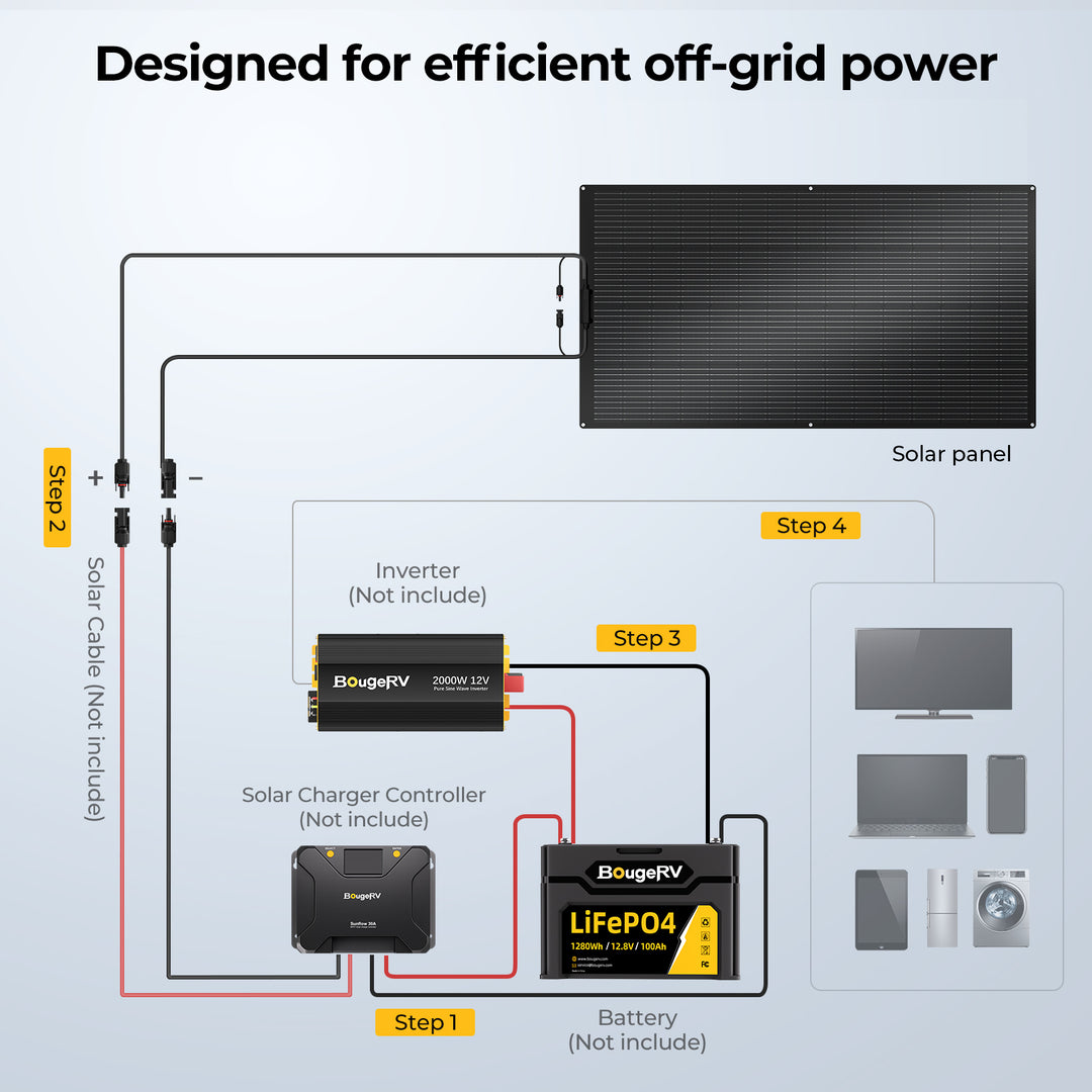 The decision to choose a curved solar panel or traditional solar panel depends on the specific requirements, budget, and personal preferences. The BougeRV 100W flexible solar panel, made of glass fiber, incorporates the advanced 10BB cell design and an extended lifespan for the panel.