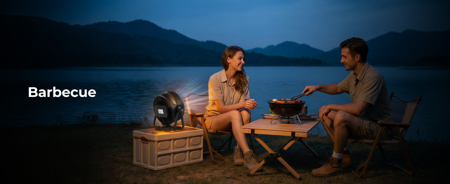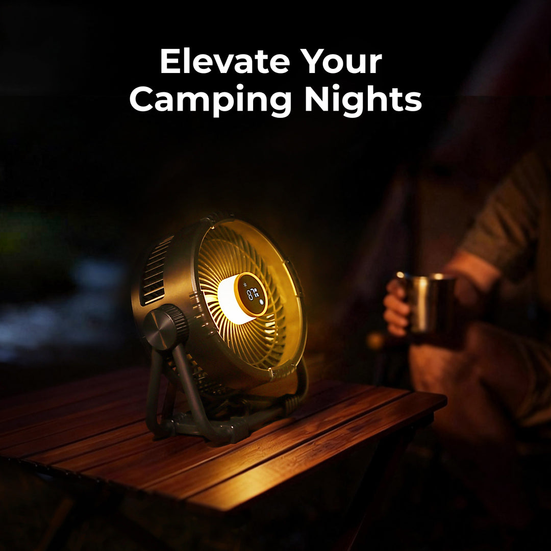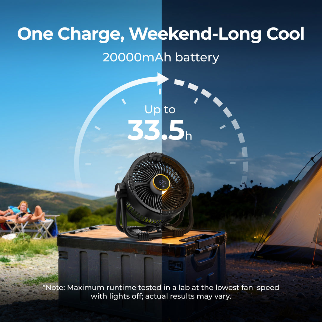 BougeRV F01 Outdoor Fan it's smooth, powerful airflow circulates fresh air through your tent, van, or RV—keeping you cool without disruptive noise. Powered by a 20,000mAh rechargeable battery, it delivers all-night comfort and continues well into the next day. As evening falls, the built-in adjustable warm LED light creates a soft, inviting glow that turns any campsite into a relaxing retreat.