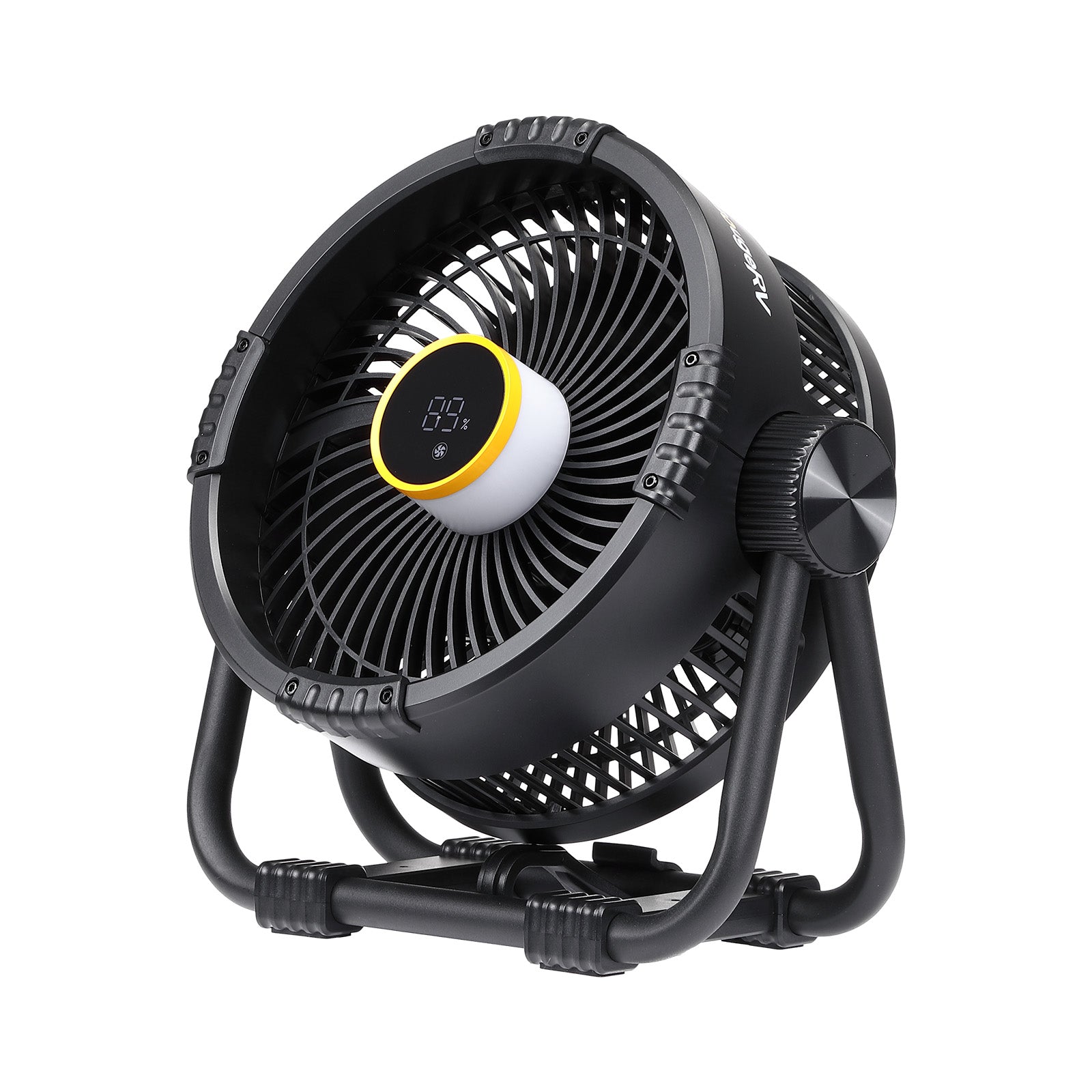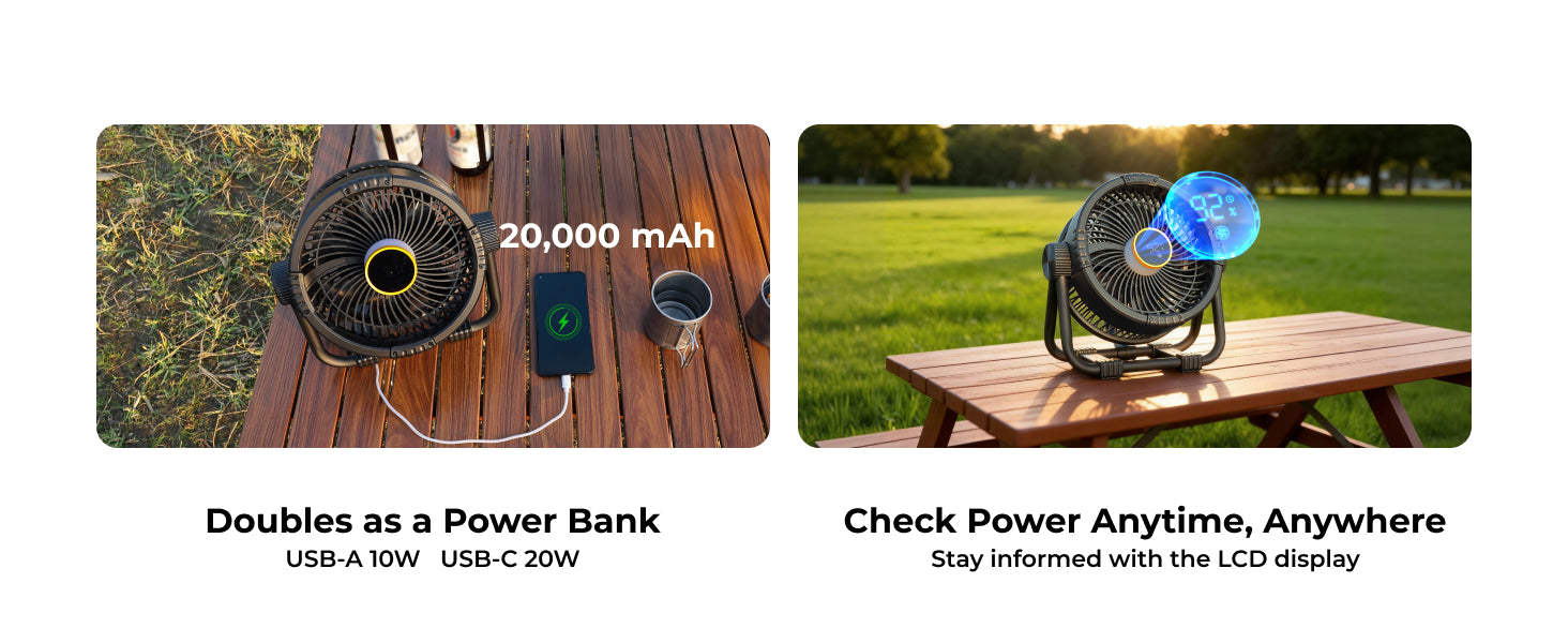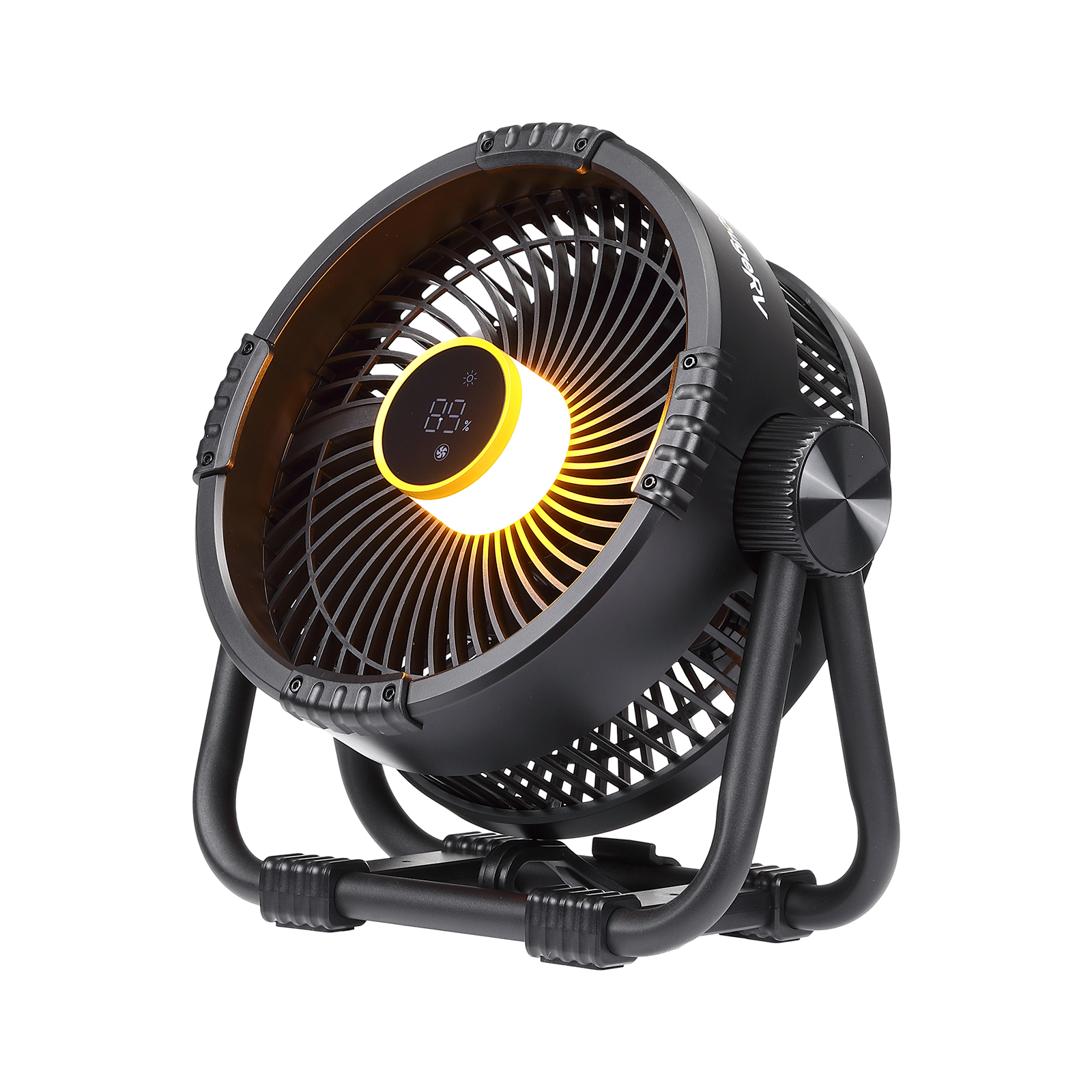 BougeRV F01 Outdoor Fan it's smooth, powerful airflow circulates fresh air through your tent, van, or RV—keeping you cool without disruptive noise. Powered by a 20,000mAh rechargeable battery, it delivers all-night comfort and continues well into the next day. As evening falls, the built-in adjustable warm LED light creates a soft, inviting glow that turns any campsite into a relaxing retreat.