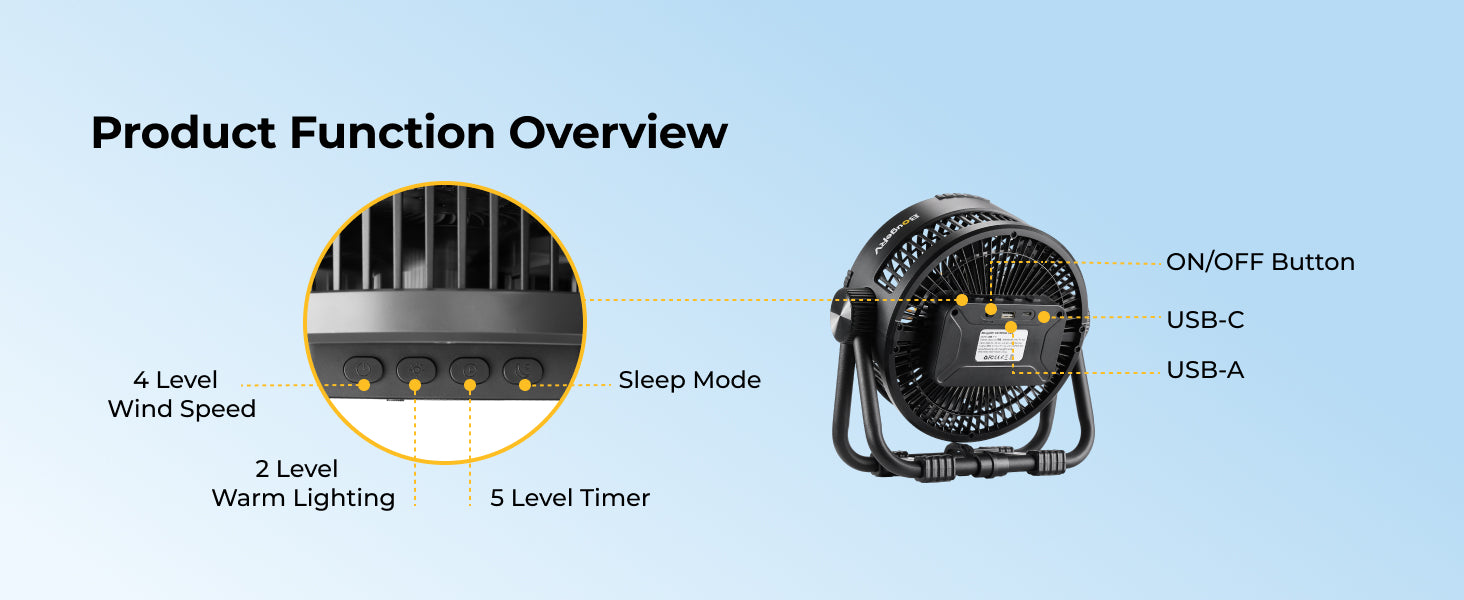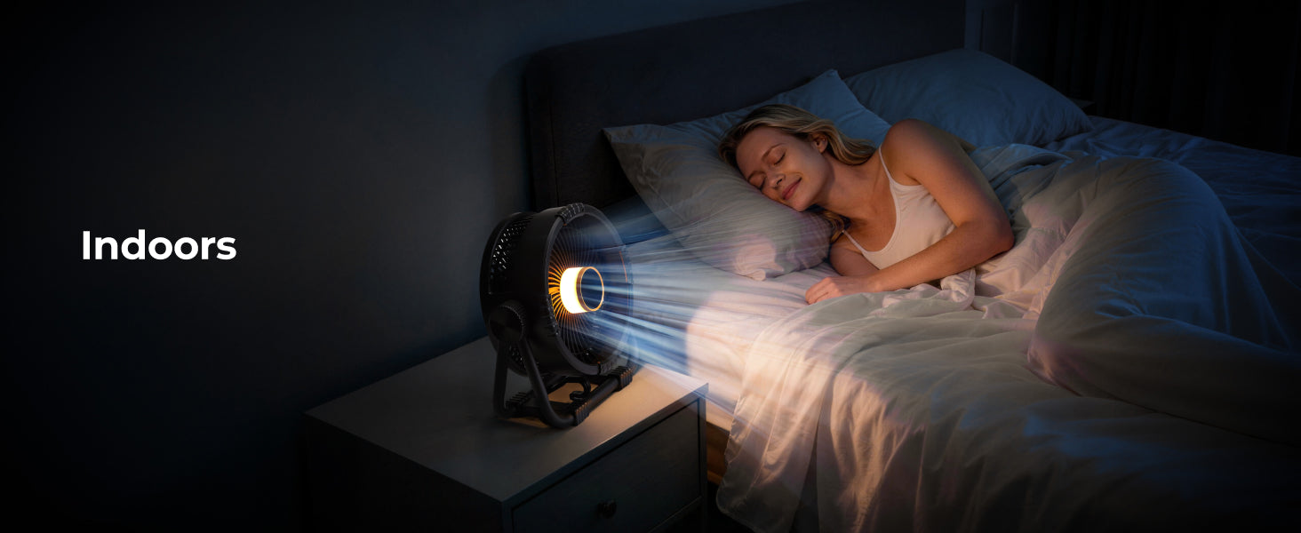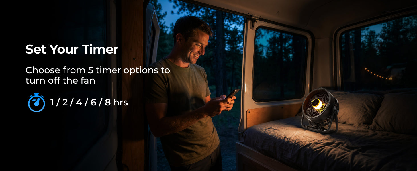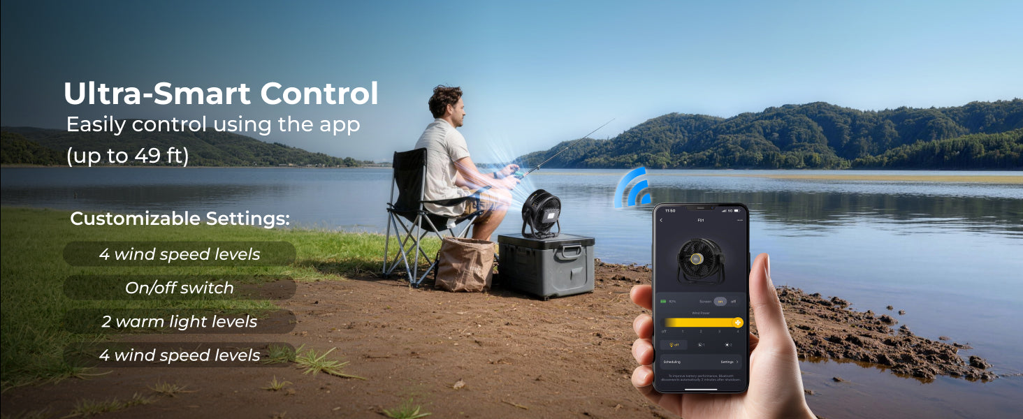 Designed to travel wherever you do, the fan is lightweight, compact, and easy to place or hang—on a camp table, inside a tent, or mounted overhead. The fan head adjusts smoothly to direct airflow exactly where you need it, while fast USB-C charging gets you fully powered again in just a few hours. With BougeRV app control, you can fine-tune airflow and lighting from up to 15 meters away—without leaving your chair or sleeping bag.