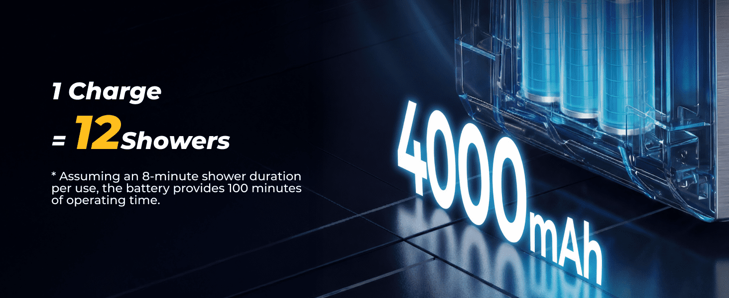 The BougeRV portable water heater features a built-in 4000 mAh rechargeable lithium-ion battery. A full charge can power the water pump for up to 15 showers, giving you multiple uses of hot water outdoors without recharging.