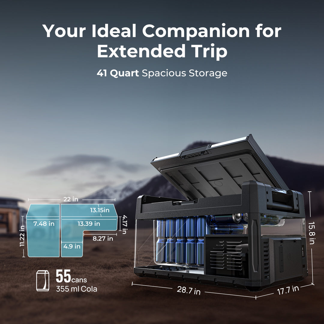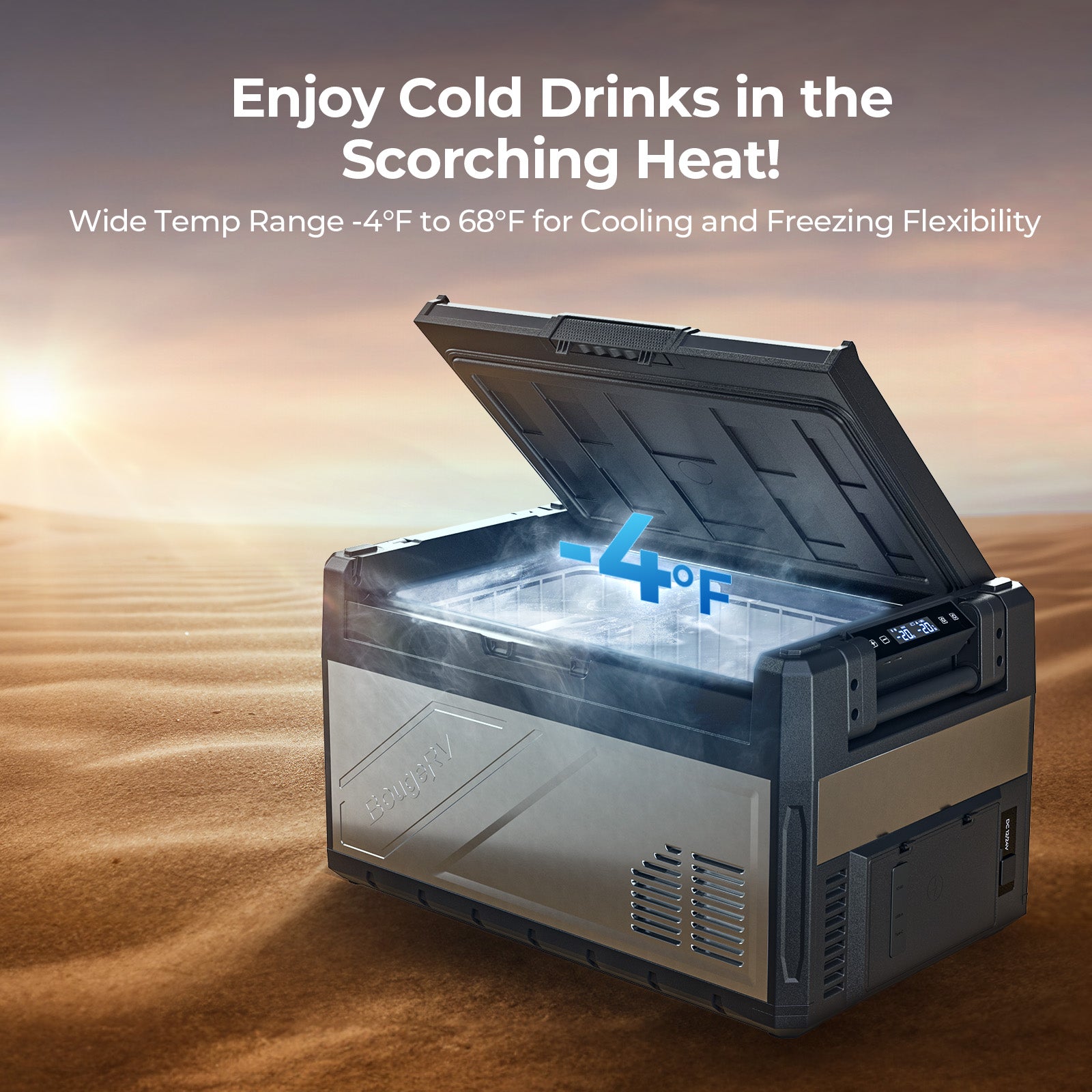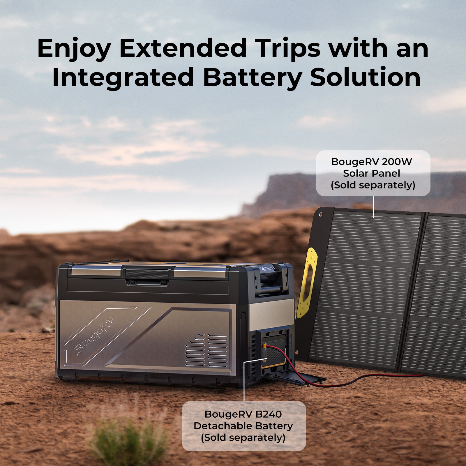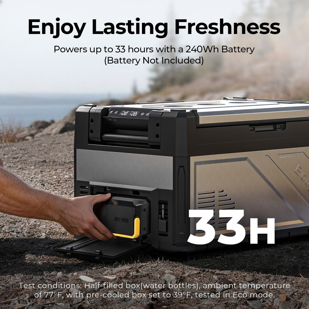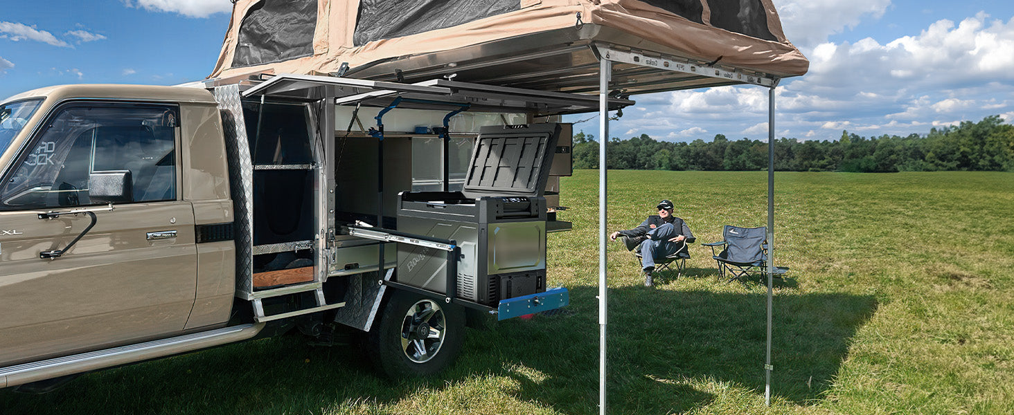 Our overlanding coolers are powered by a 12/24V DC car plug or a 100-240V AC (using the adapter), or 12-50V solar.