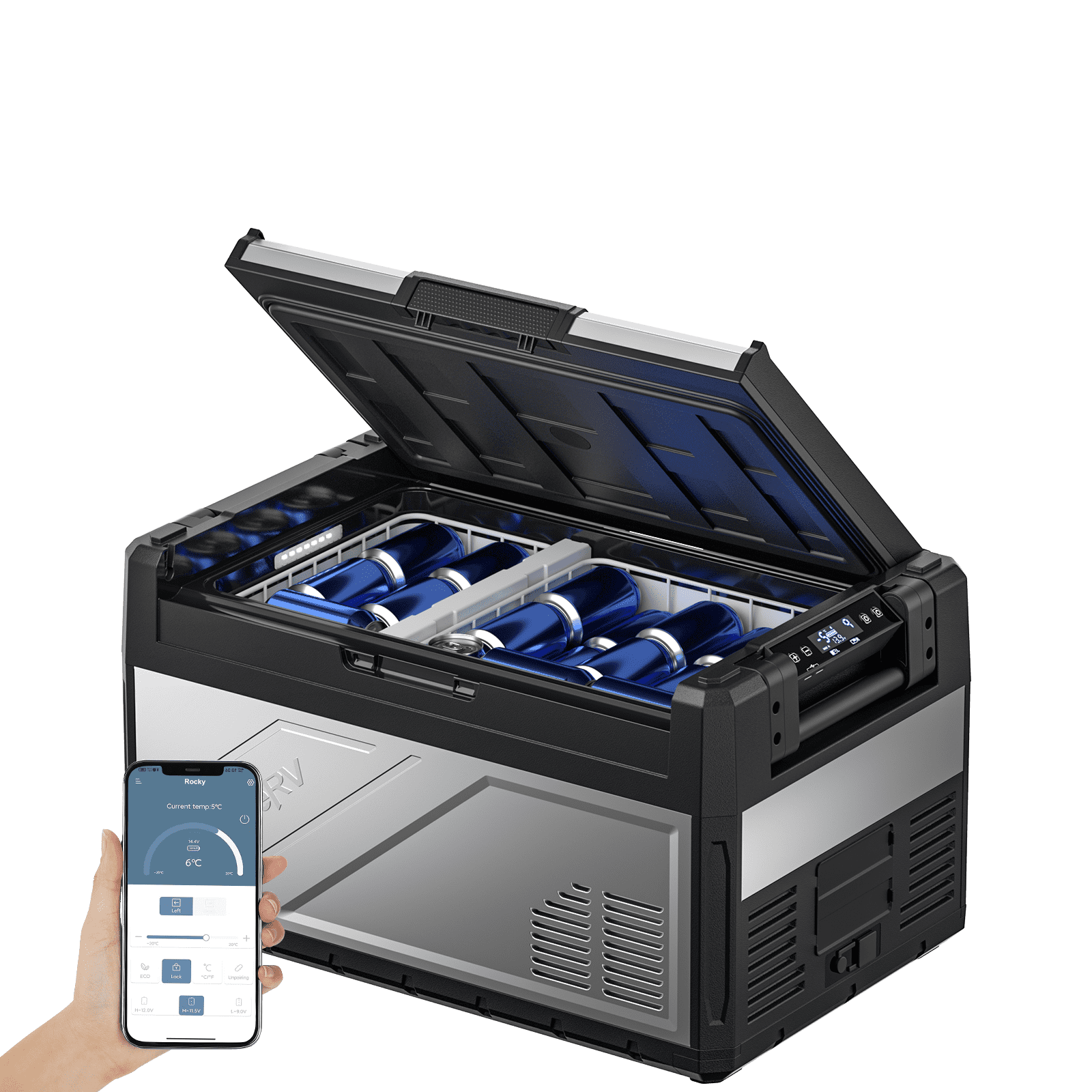 Our overlanding coolers are powered by a 12/24V DC car plug or a 100-240V AC (using the adapter), or 12-50V solar.