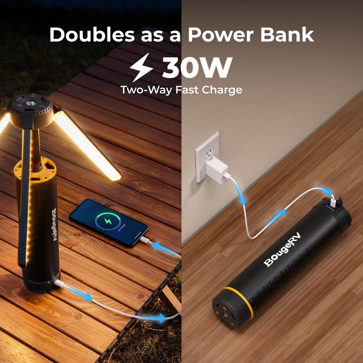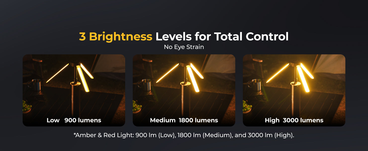 BougeRV T1 camping lantern outputs up to 3,000 lumens, providing bright, reliable lighting that can cover an area of up to 1,076 ft², enough to illuminate a large campsite, picnic area, or outdoor work zone.