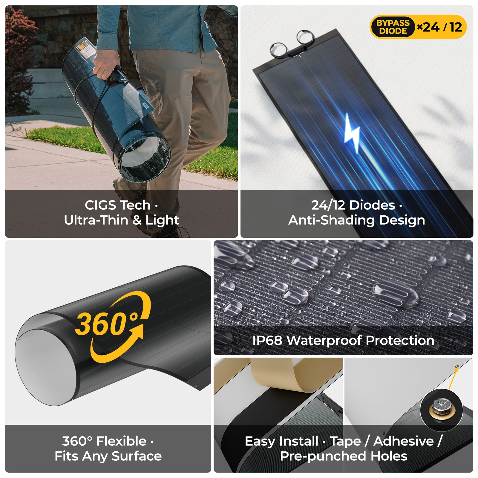 Yuma 100W CIGS Thin-film Flexible Solar Panel (Square with Adhesive) is incredibly versatile and can be installed on a wide range of surfaces, including RVs, trucks, boats, tents, and roofs. Additionally, its lightweight design makes it easy to roll up and take with you wherever you go, functioning as a portable solar panel.